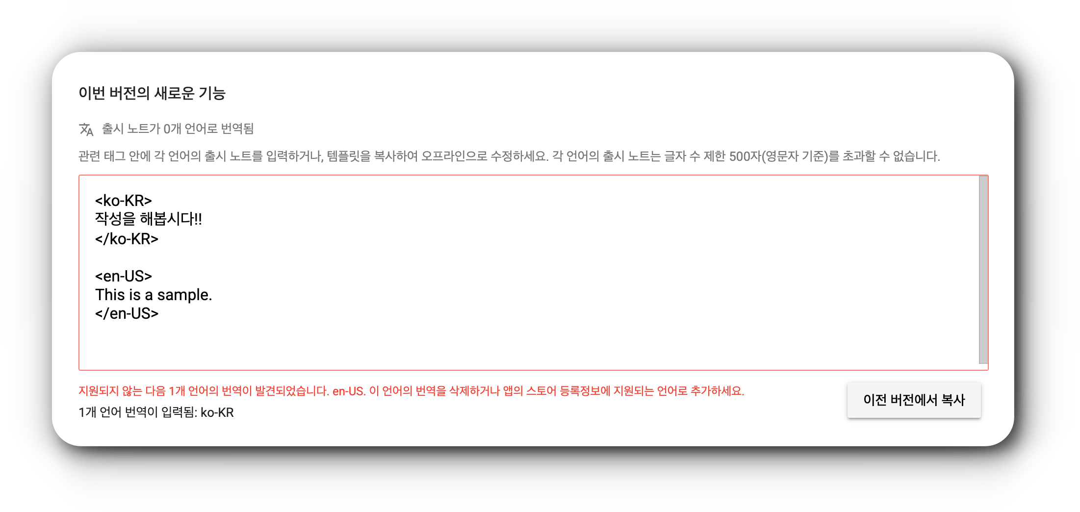 en-US. 이 언어의 번역을 삭제하거나 앱의 스토어 등록정보에 지원되는 언어로 추가하세요."