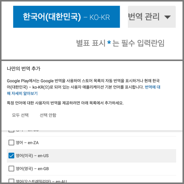 여기서 본인이 원하는 언어를 선택하고 해당 언어로 앱 정보를 입력하면