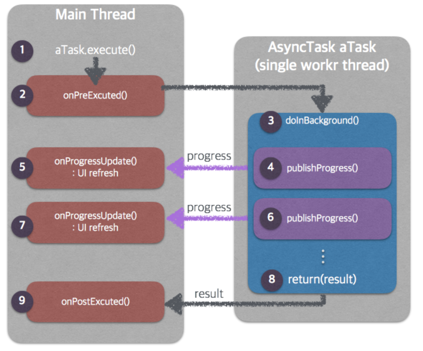 - 메인 쓰레드 : onPreExecute(), onProgressUpdate(), onPostExecute()