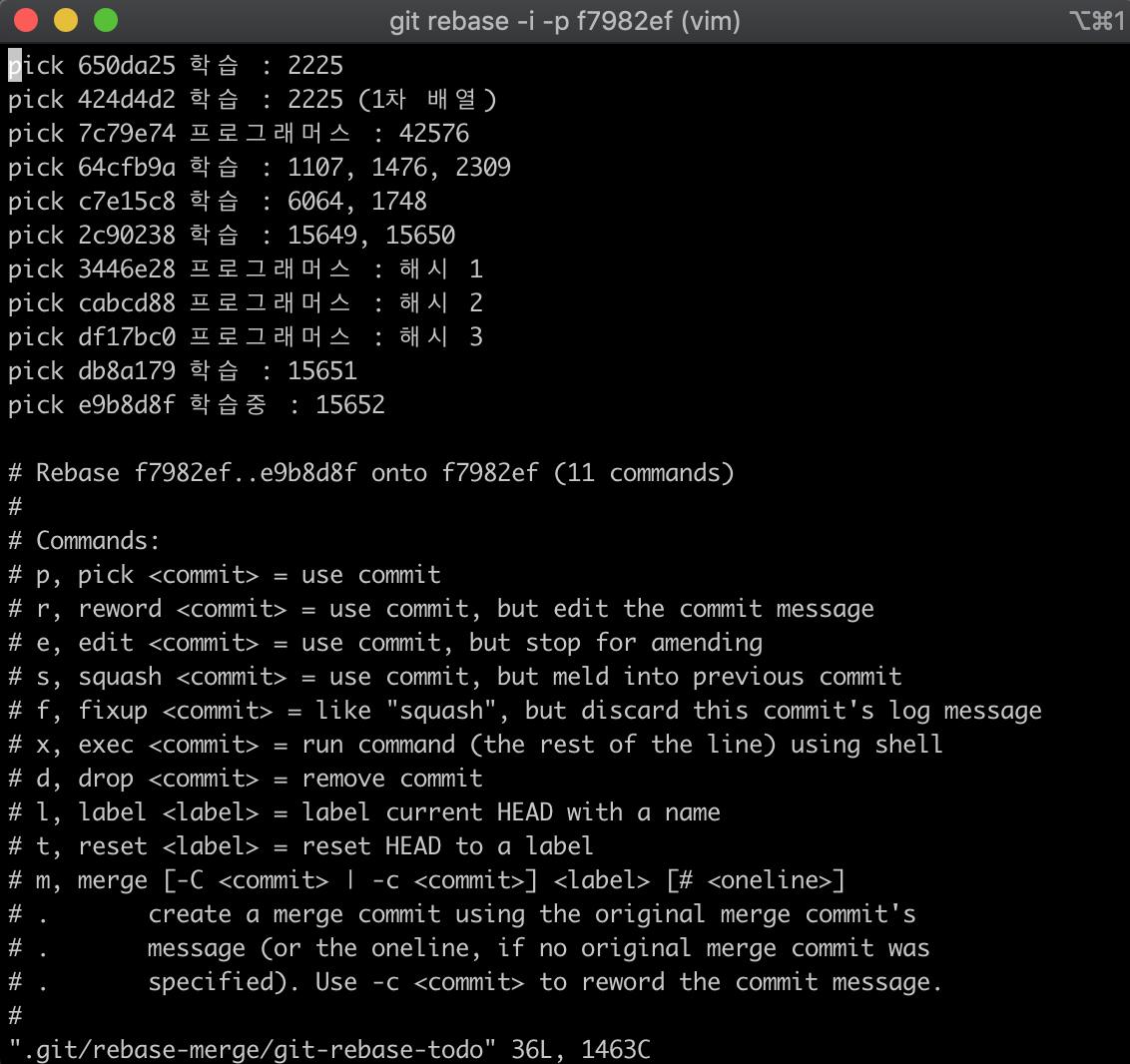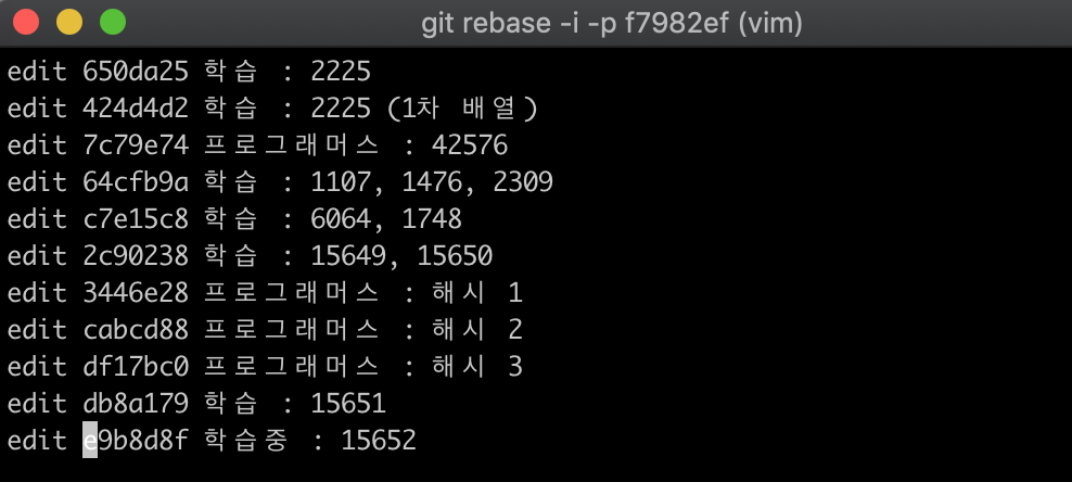 위 이미지에서 원하는 커밋 해쉬를 pick이라고 적혀있는 것을 edit라고 고치면 된다.