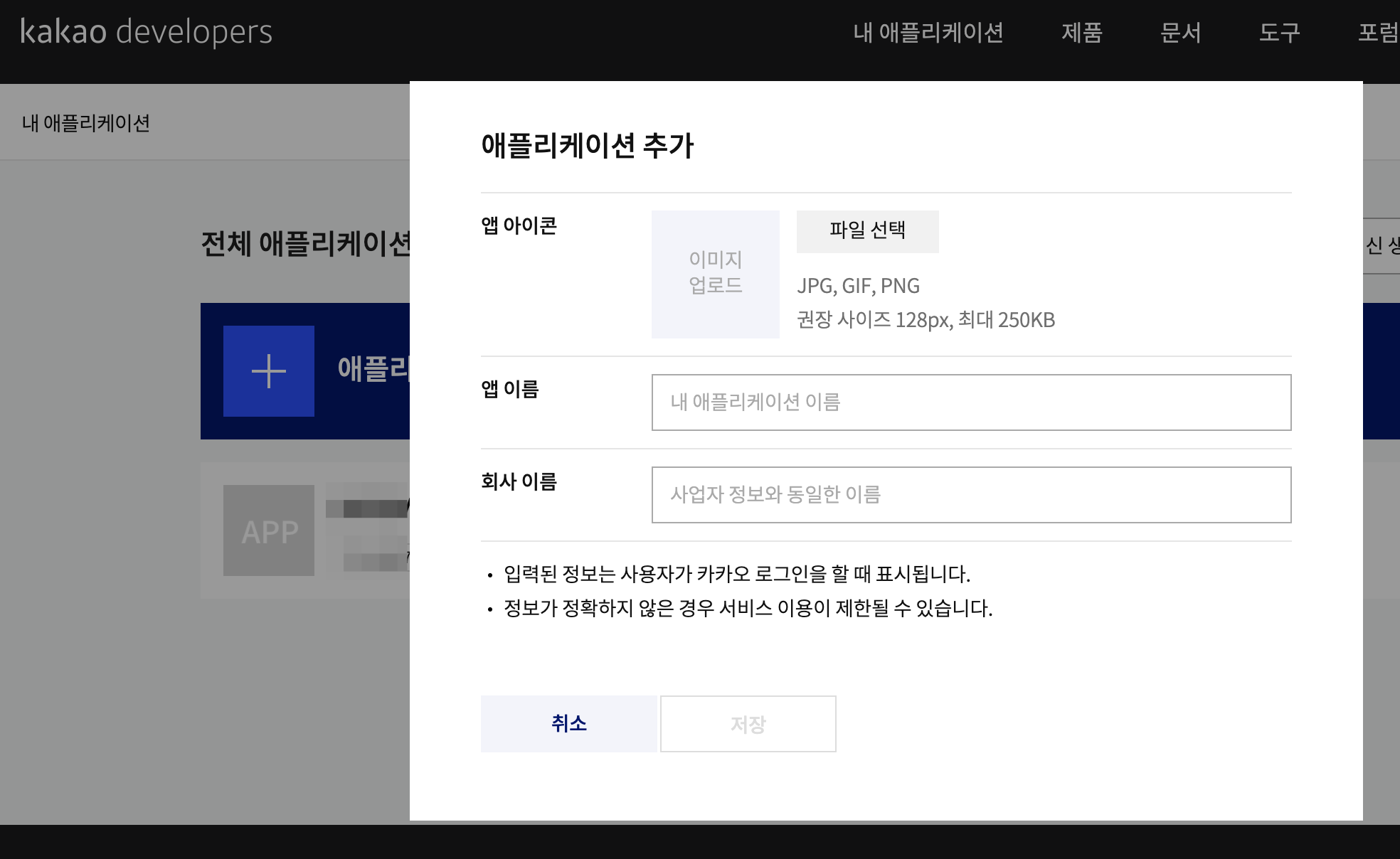 3. 애플리케이션 추가 버튼을 클릭하고 내용을 자유롭게 작성한다. (아이콘 이미지 안넣어도 됨)