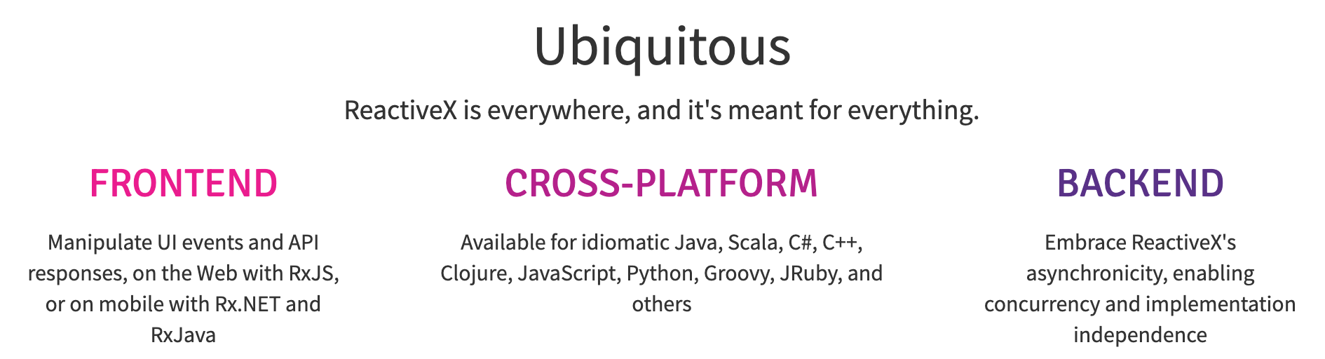 No. ReactiveX 홈페이지를 가보면 "ReactiveX is everywhere, and it's meant for everything."이라고 나타나 있으며 아래의 이미지를 볼 수 있다. 즉, 백엔드와 크로스 플랫폼까지 다양한 곳에서 이용되고 있다.