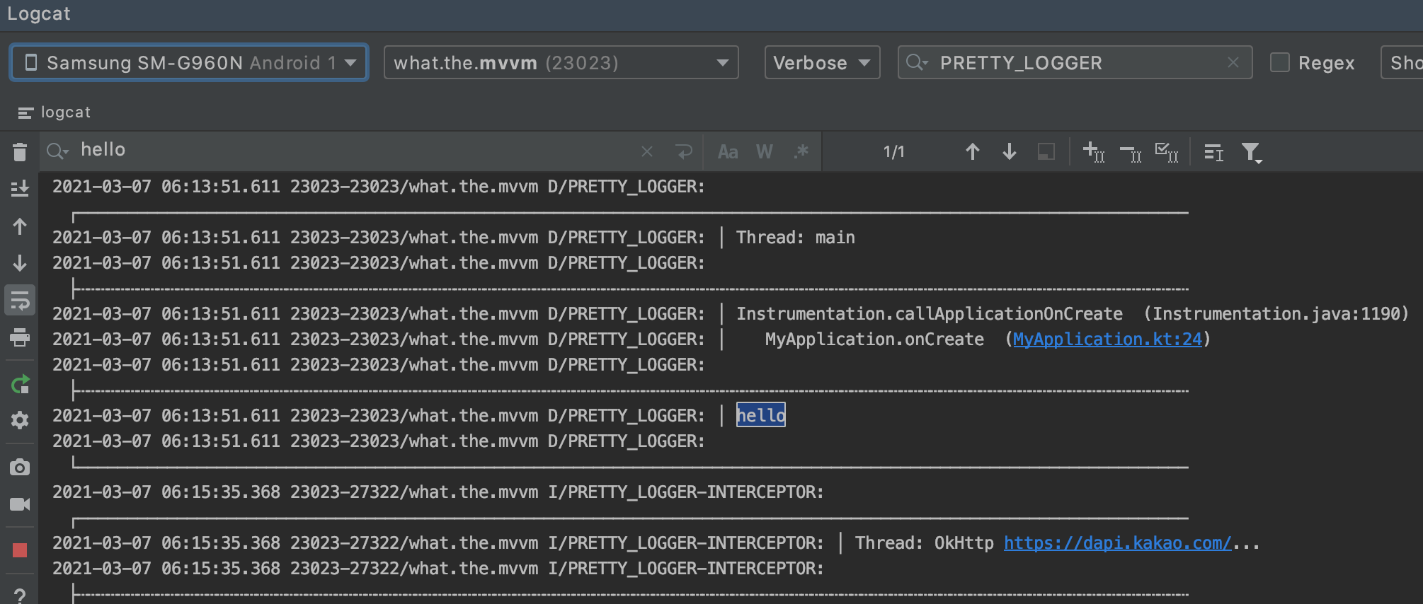 TAG가 들어가는 Verbose 부분을 잘 보라. "PRETTY_LOGGER"라고 입력하면 예쁜 로그 출력을 볼 수 있다.