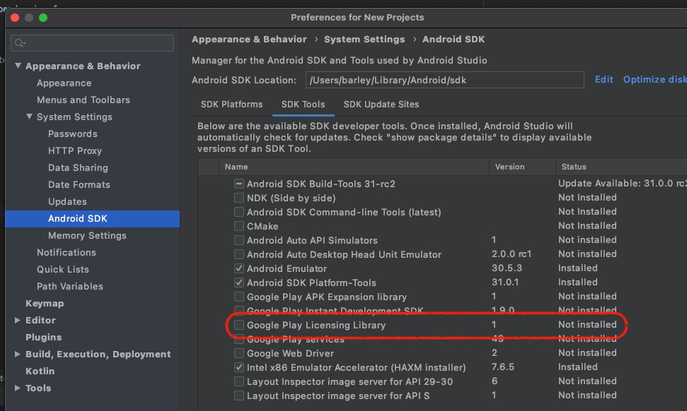 M1에서 나타나는 이슈인가해서 살짝 긴장을 했는데, 다행히 그런건 아닌 것으로 보인다. 여러가지 이유가 있을 수 있지만 내 경우에는 Google Play licensing library가 설치되지 않아 생긴 이슈였다. Google Play licensing library에 대해 궁금하다면 라이선스를 위한 관리 기능 설정에서 Google Play 라이선스의 영향을 보면 조금 이해할 수 있다.