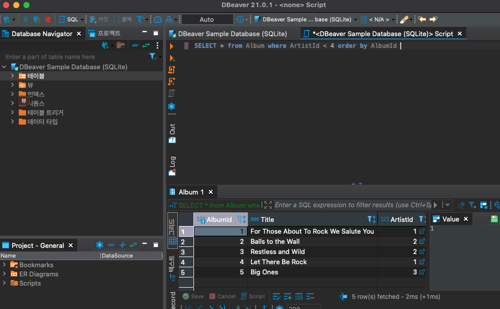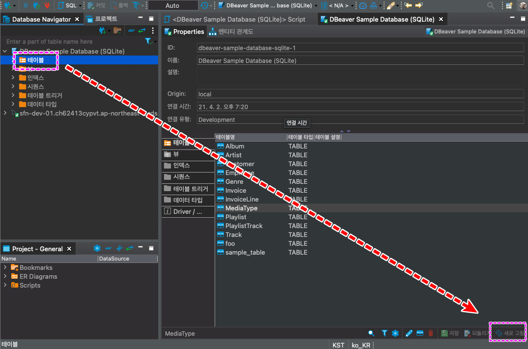 테이블을 생성했는데(CREATE TABLE 테이블명) 왼쪽 프로젝트에서 내가 만든 테이블이 나타나지 않는다면? 프로젝트 - 테이블을 선택하고 오른쪽 하단의 새로고침을 클릭하면 생성한 테이블이 나타나는 것을 확인할 수 있다.