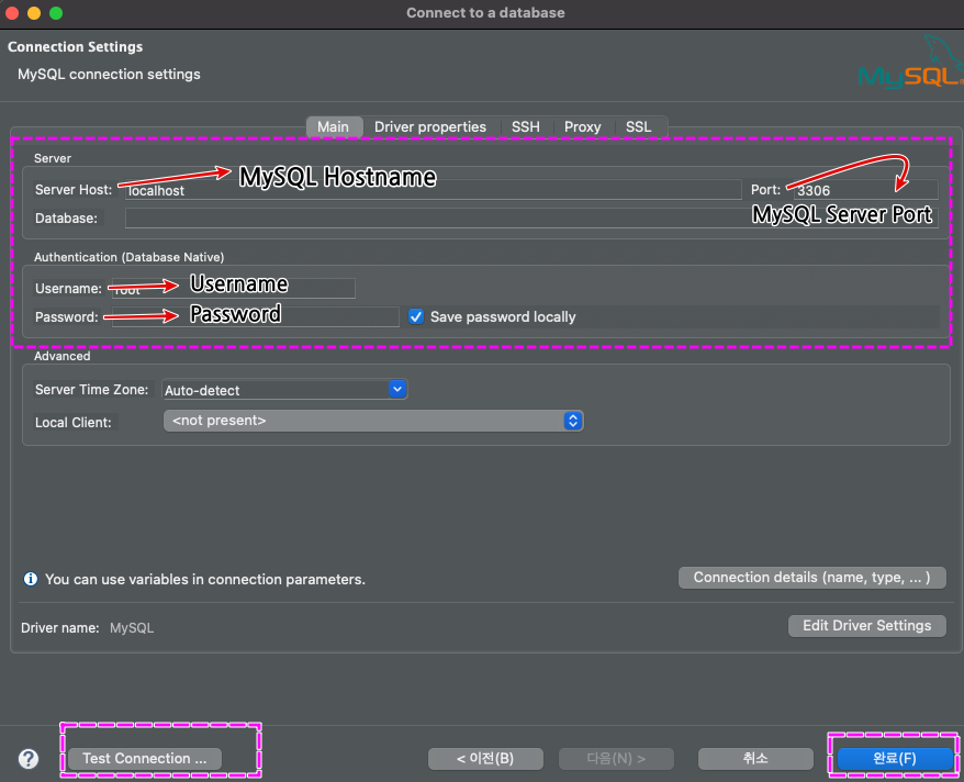 - Port 입력 (워크벤치 기준 MySQL Server Port에 해당)
