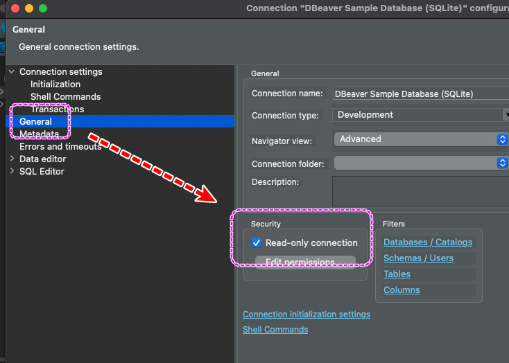 위에서 보는 것처럼 권한 부여를 하고자 하는 DB를 선택해서 "Edit Connection"을 클릭한다. 아래와 같은 화면이 나타나면 General을 클릭하고 Security란에 Read-only connection 체크박스를 클릭하면 해당 DB를 오직 읽기 권한으로만 사용하게 된다.