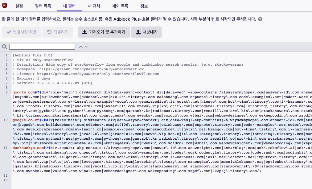 위 앱을 설치하고 나면 이제 only-stackoverflow에서 필터를 긁어오자. 이 필터는 구글과 덕덕고에서 유사 stackoverflow 사이트가 나타나는 것을 막아주는 역할을 한다.