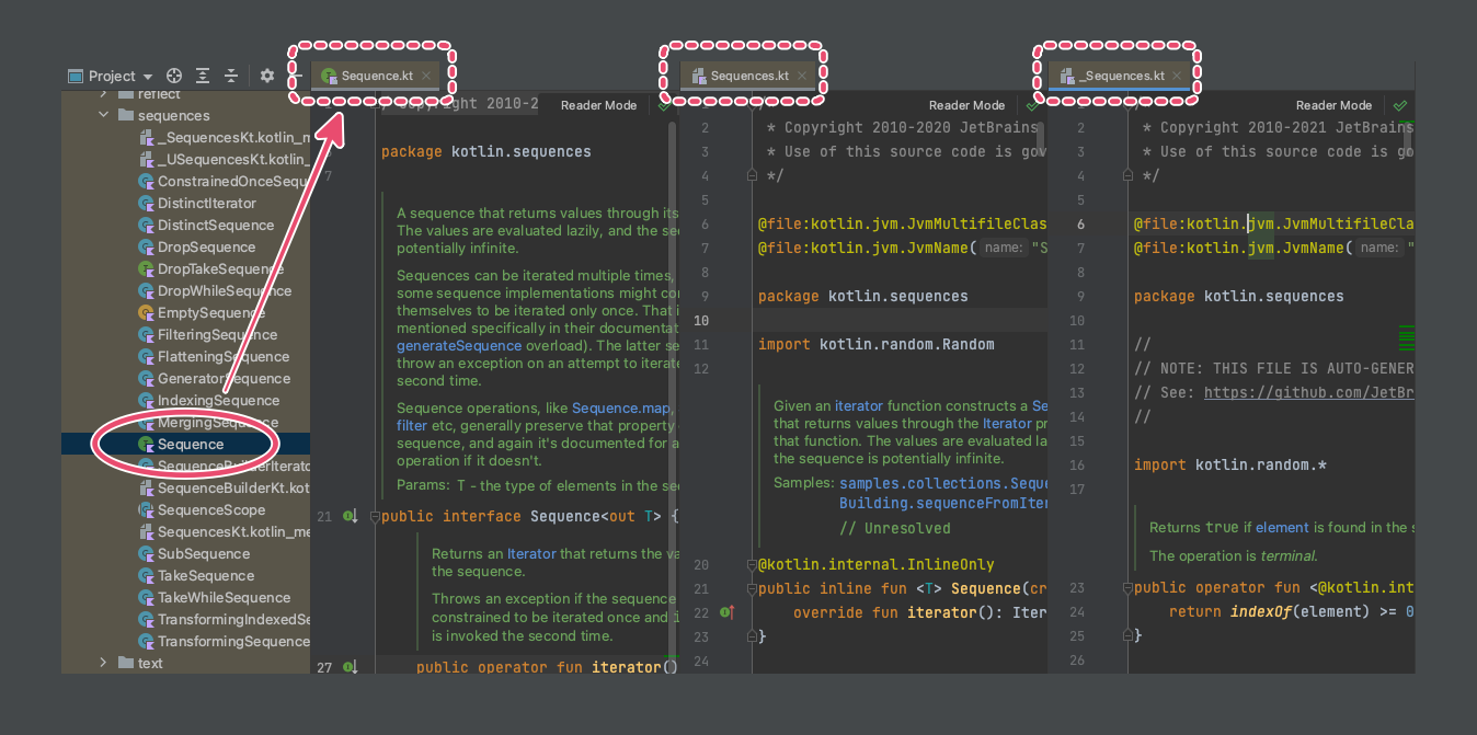 Sequence 인터페이스를 학습하고 있었다. 공부하던 예시에서 구현한 라이브러리를 보려고 추적을 했는데 아래와 같이 2개의 파일을 발견했다. 아래 이미지에서 가장 왼쪽은 Sequence 인터페이스, 그리고 중간이 Sequence.kt, 오른쪽이 _Sequence.kt 파일이다. 왜 동일한 package에 언더바를 제외하면 동일한 이름의 파일이 2개나 있을까?
