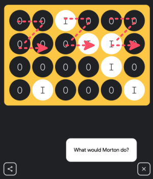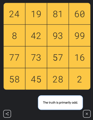 즉, 가장 마지막 숫자인 2를 제외한(짝수니깐) 소수를 찾는 것. 타일이 16개이니 16개의 점을 만들고 왼쪽 위부터 순서를 세어 소수가 되는 위치에 점의 상태를 바꾸면 된다. 기억할지 모르겠지만 = 버튼을 눌렀을 때 힌트 버튼에 "31"이 등장한다. 이것도 소수다. 간접적으로 힌트를 준 셈.