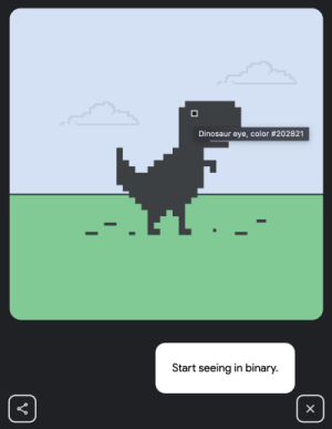 이게 무슨 말인가. 많은 사람들이 바이너리에 포커싱을 맞추겠지만 진짜는 "seeing(보다)"에 있다. 마우스 커서를 공룡 눈에 가져가면 위 이미지처럼 나타난다.