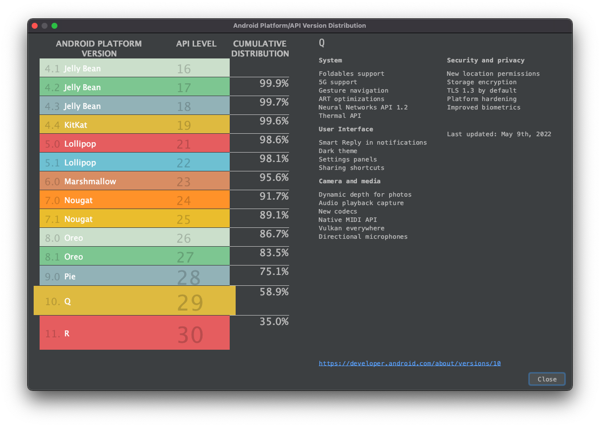 위에서 보이는 것처럼 안드로이드는 수많은 API 버전이 존재한다. API 버전이 올라가면서 안드로이드 기술이나 안드로이드를 개발하는 IDE인 안드로이드 스튜디오도 같이 발전했다. 그러다보니 1년만 지나더라도 구식 기술이 되는 경우도 있다. 현시점에서 제대로된 안드로이드 기본서를 찾을 때 최신 정보가 포함되어야 수많은 안드로이드 디바이스를 커버하고 더 나은 앱 퍼포먼스를 구현할 수 있는 것이다. 위 차트에서는 11 버전까지만 다루고 있지만 아직 비중이 낮아 보이지 않는 12 버전도 미리 준비하면 좋다. 그럼 어떤 서적이 기본서 역할을 하면서 안드로이드 최신 정보를 담고 있을까?