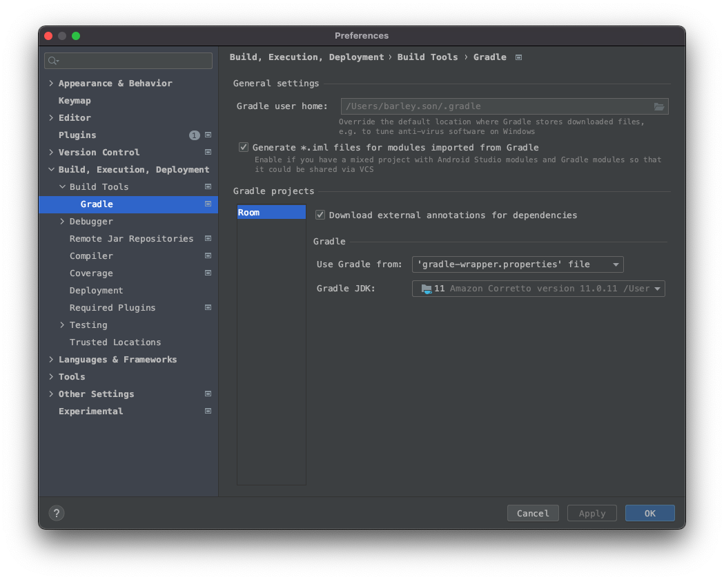 이 경우에는 Preferences -> Build, Execution, Deployment -> Build Tools -> Gradle로 가서 JDK 버전을 11로 변경하면 된다. 아래 이미지를 참고하시길.