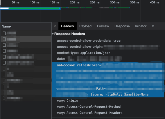 이렇게 세팅을 하고 로그인을 하면 크롬 브라우저 개발자 도구에서 아래 이미지처럼 set-cookie에 값이 입력된 것을 볼 수 있다. 필자는 쿠키 내부에 토큰을 넣었다. 원하는 값 외 옵션 값도 들어가 있음을 볼 수 있다.