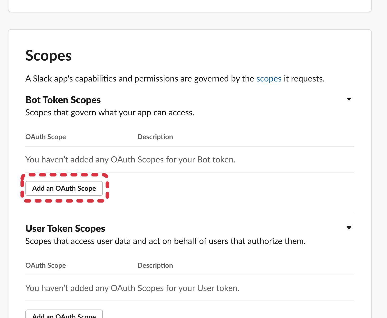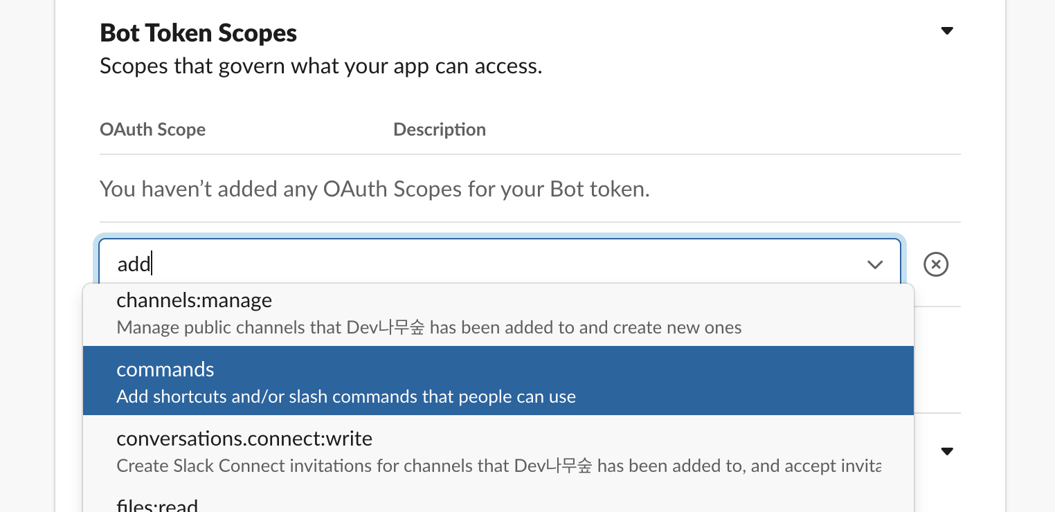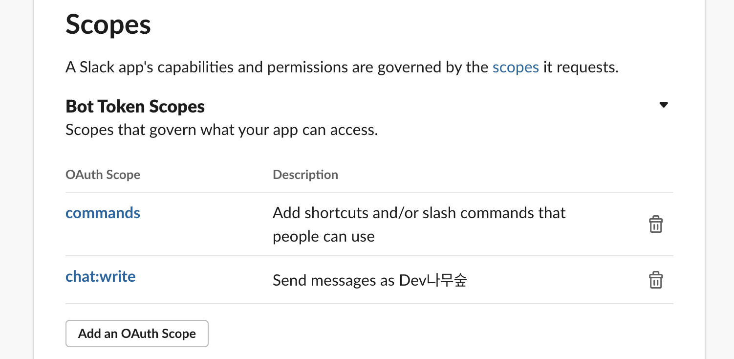 'Add an Oauth Scope'를 클릭해서 2개의 스코프를 등록한다. Commands는 앱 바로가기 또는 커맨드 명령어로 대나무숲 메세지를 보내기 위한 용도이고, 'chat:write'는 대나무숲 봇이 메시지를 전송하기 위한 권한 설정이다.