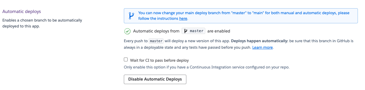 아래는 'Enable Automatic Deploys' 버튼을 클릭해서 자동배포가 활성화된 모습이다.
