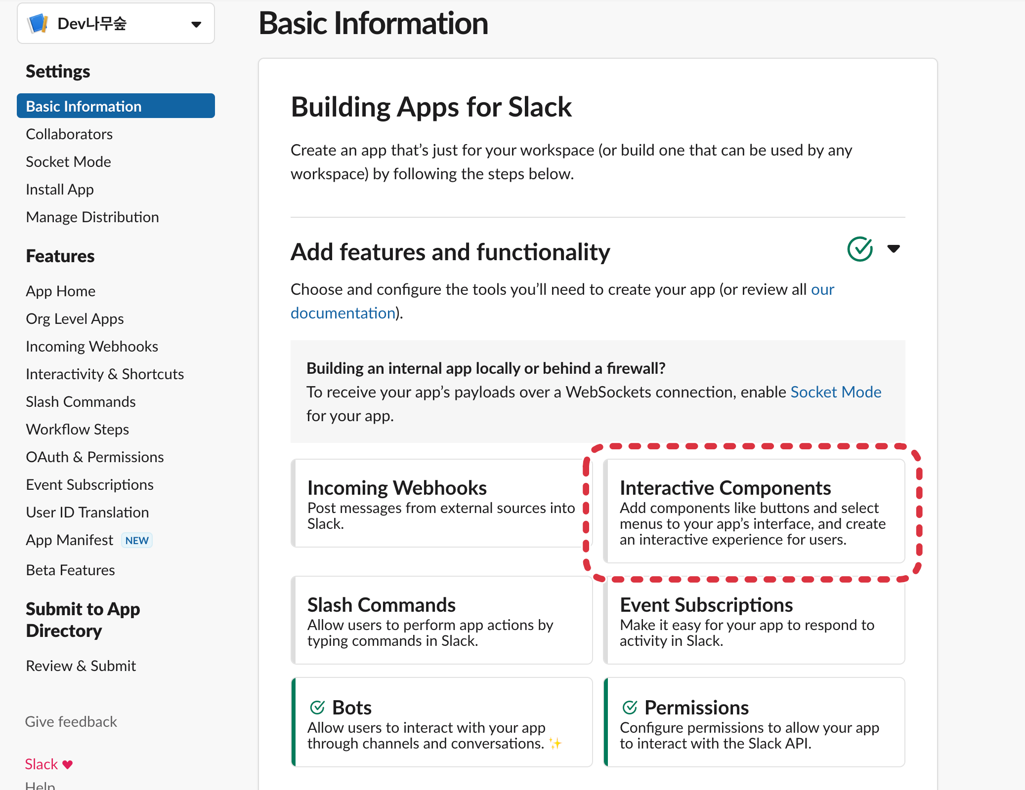 필자가 많이 헤맨 부분이다. 나처럼 고생하지 않길 바래본다. 먼저 재그지그 블로그의 가이드에 나와있는 앱 바로가기 세팅부터 해보자. 슬랙앱 Settings - Basic Information - Add features and functionality - Interactive Components 혹은 왼쪽 메뉴에서 Interactivity & Shortcuts를 클릭한다.