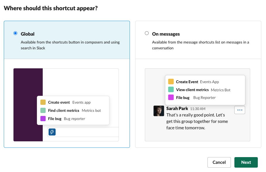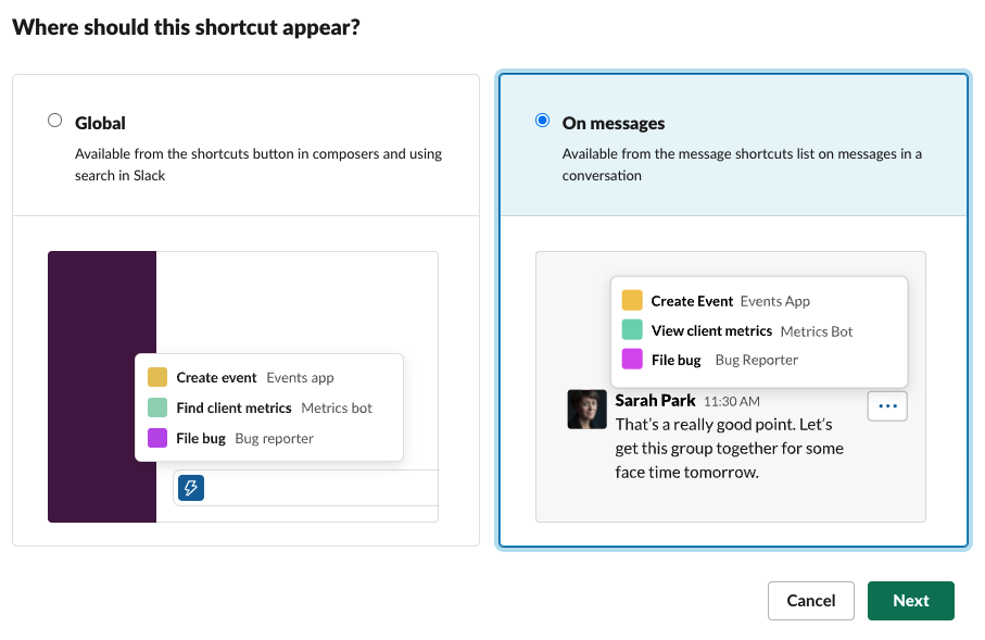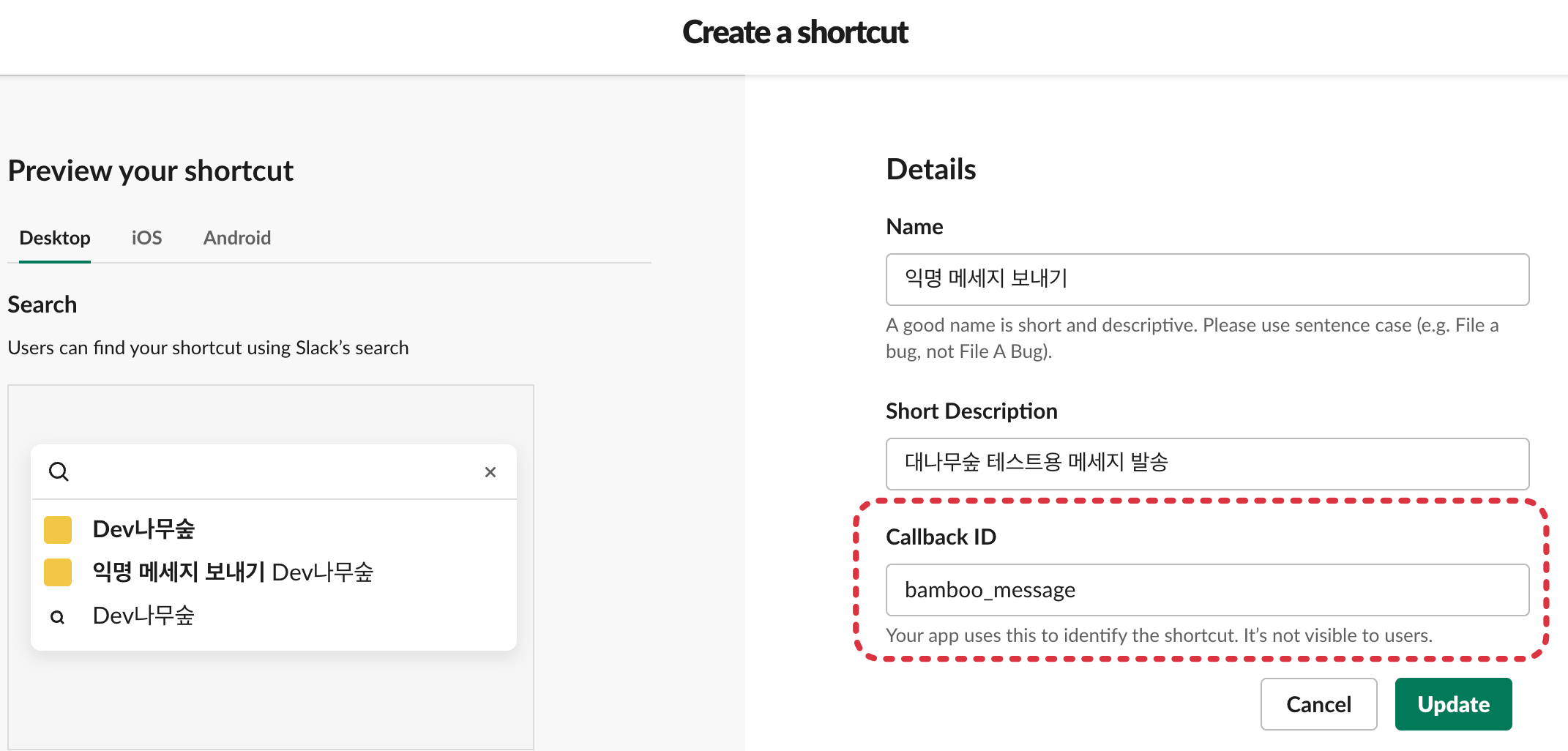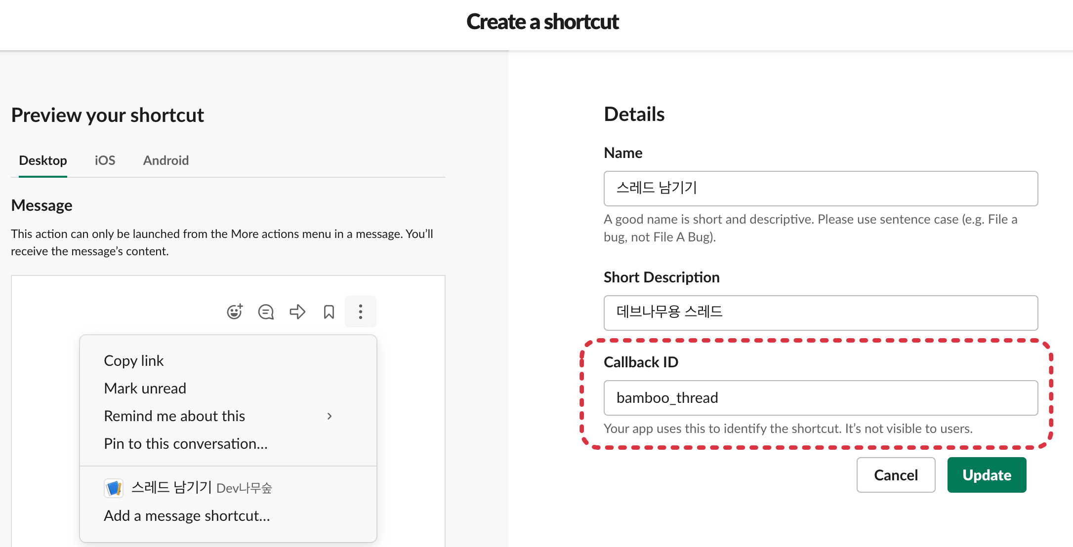 익명글에 스레드를 남기는 바로가기도 추가해보자. 'On messages'를 선택하고 바로가기의 이름과 설명, Callback ID를 입력한다. 여기서도 Callback ID를 'Callback_message'로 해야한다.