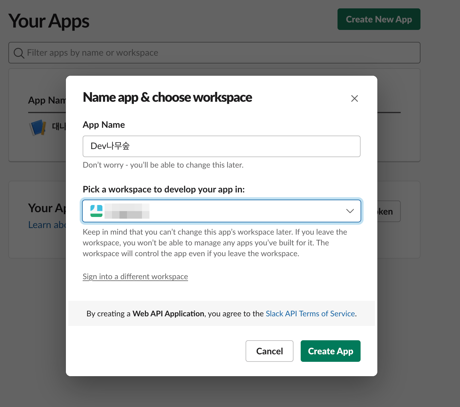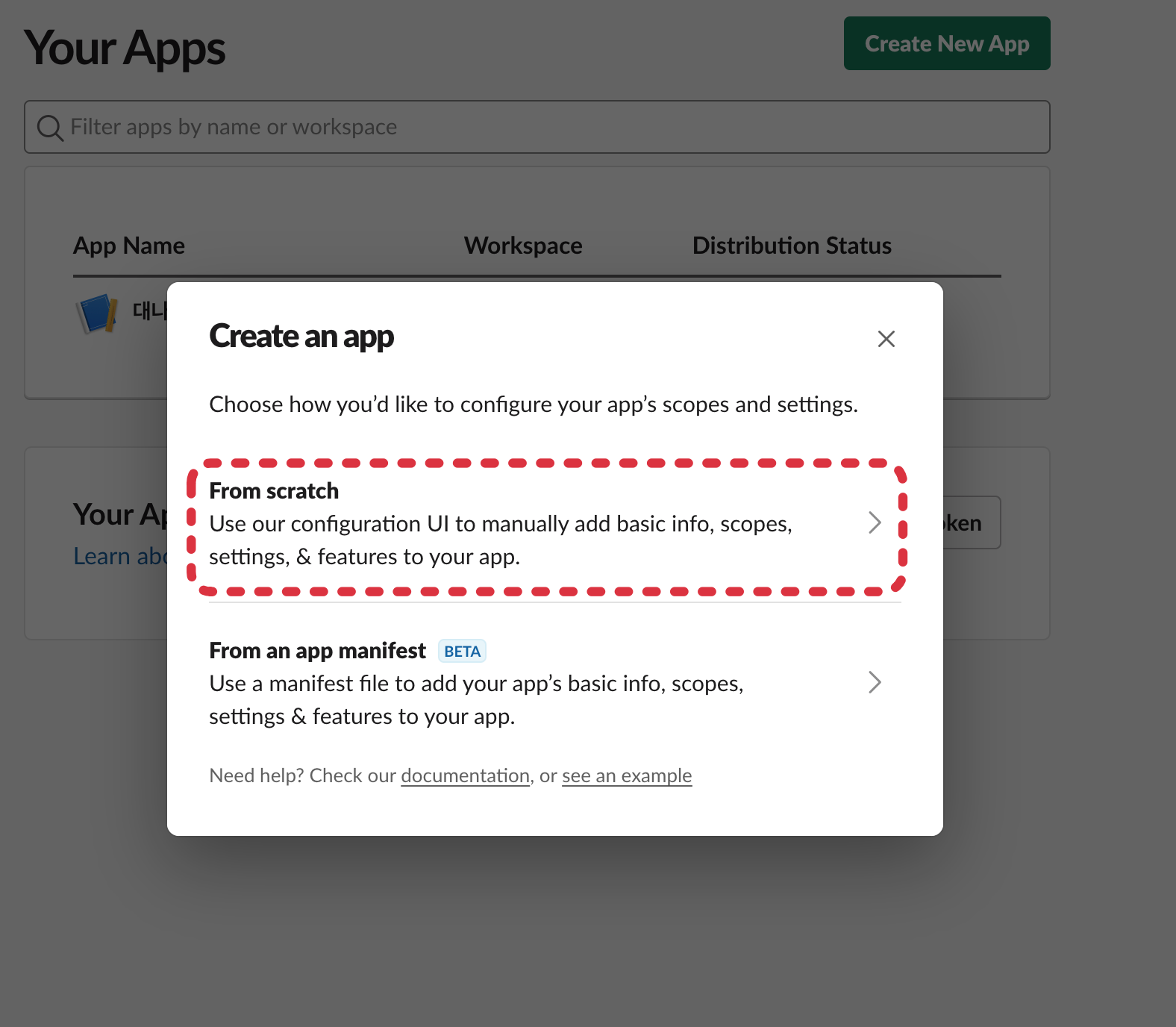 'From scratch'를 클릭한다. 다음 화면에서 앱 이름을 작성하고 슬랙앱이 연동될 슬랙 워크스페이스를 선택한다. 연습삼아 만드는 것이라면 워크스페이스를 미리 하나 만들어서 실습해보는 것이 좋다.