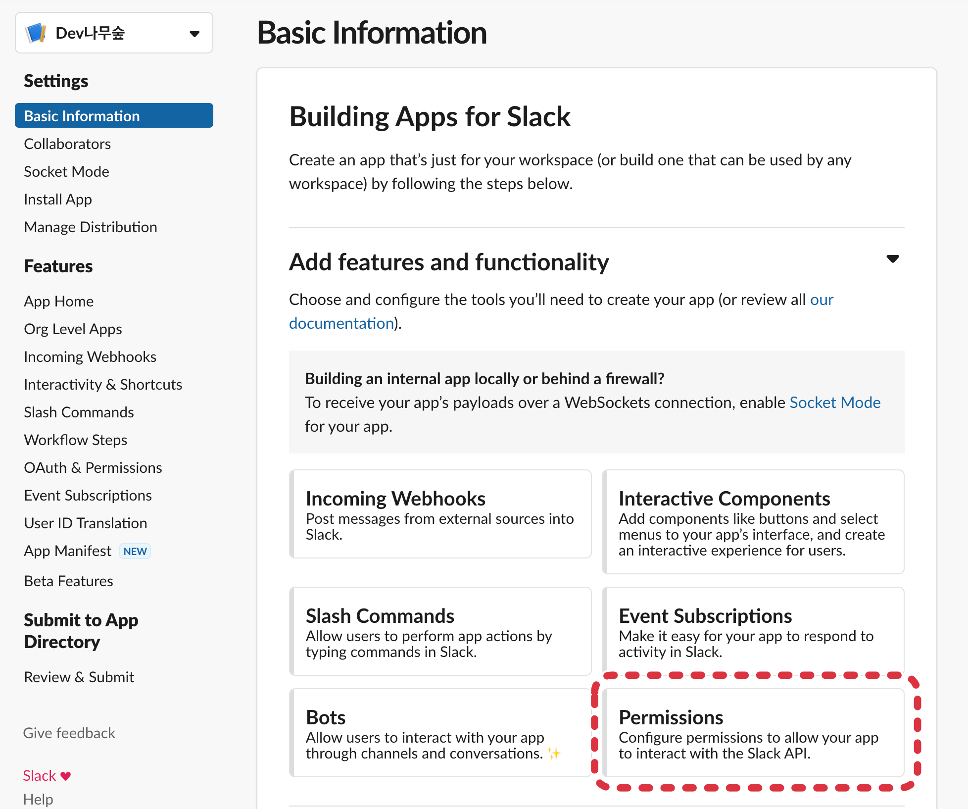 앱이 생성되고 만든 앱을 클릭해서 설정화면에 진입한다. 앱 Setting 화면이 나타나면 Settings - Basic Information - Permissions를 클릭한다. Permissions 화면 중간에 Scope를 지정할 수 있는 레이아웃을 볼 수 있다.