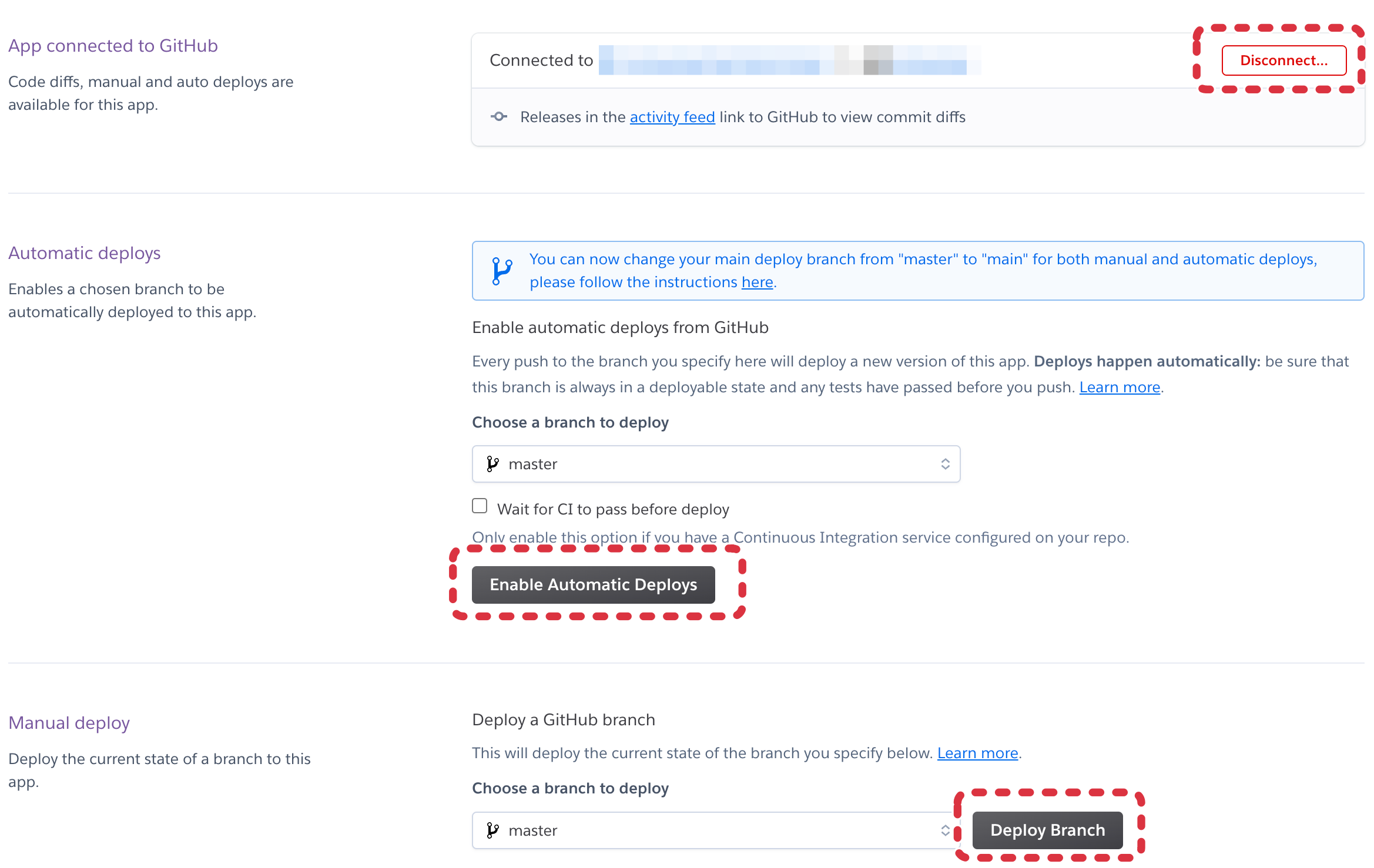 아래 이미지에는 Disconnect라고 나와 있지만 처음 진입할 때는 Connect라는 버튼이 보일 것이다. 이 버튼도 클릭해서 활성화시킨다. master 브랜치에 커밋이 생성되면 자동으로 배포가 되도록 'Enable Automatic Deploys'를 클릭한다. 지금은 바로 배포를 해야하니깐 수동 배포를 위해 Deploy Branch를 클릭한다. 그러면 빌드와 관련된 로그가 보일 것이고 문제가 없다면 'Your app was successfully deployed'라는 메세지가 나타날 것이다.