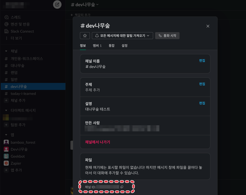 대나무숲 채널 코드는 슬랙 - 상단 채널 이름 클릭 - 하단에 채널 ID를 복사해서 붙여넣으면 된다.