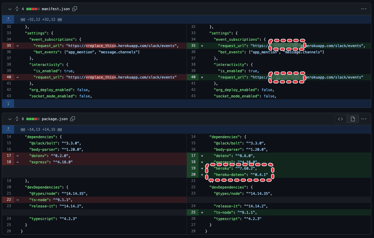 이제는 코드를 건드릴 차례. 첫번째는 Bolt.js - manifest.json에서 헤로쿠 주소를 다시 설정하는 것. 기존 재그지그 깃허브에는 replace_this로 나와 있다. 여기에 본인 헤로쿠앱 이름을 넣으면 된다. 두번째는 heroku와 heroku-dotenv를 package.json에 추가하는 것. 재그지그 깃허브 Readme를 보면 환경변수 입력하는 방법이 나오는데 헤로쿠에 .env 환경변수를 입력을 돕는 도구가 바로 heroku-dotenv이다. heroku는 계정 연결에 필요해서 추가되었다. 이 두가지 도구의 역할 설명은 아래에서 하겠다. 여기까지 입력했으면 master에 Commit한다. 나중에 알 수 있겠지만 이 커밋으로 헤로쿠는 다시 빌드하고 배포를 하게 된다.