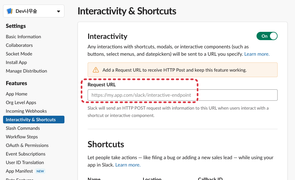 아래 이미지처럼 Interactivity를 On으로 만들고, Request URL에 헤로쿠 서비스 URL을 입력한다.