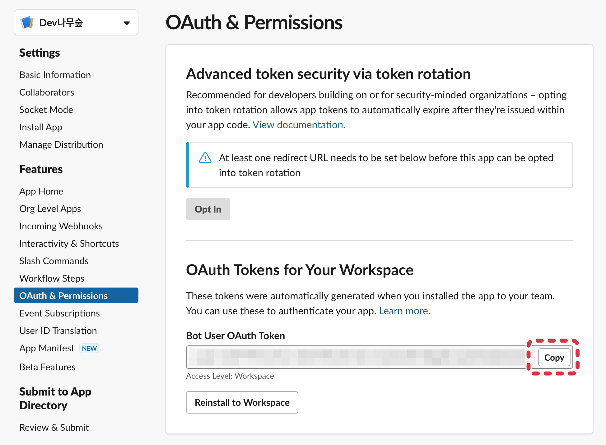 슬랙 봇 토큰은 OAuth & Permissions - OAuth Tokens for Your Workspace - Bot User OAuth Token을 Copy해서 .env에 붙여넣으면 된다.