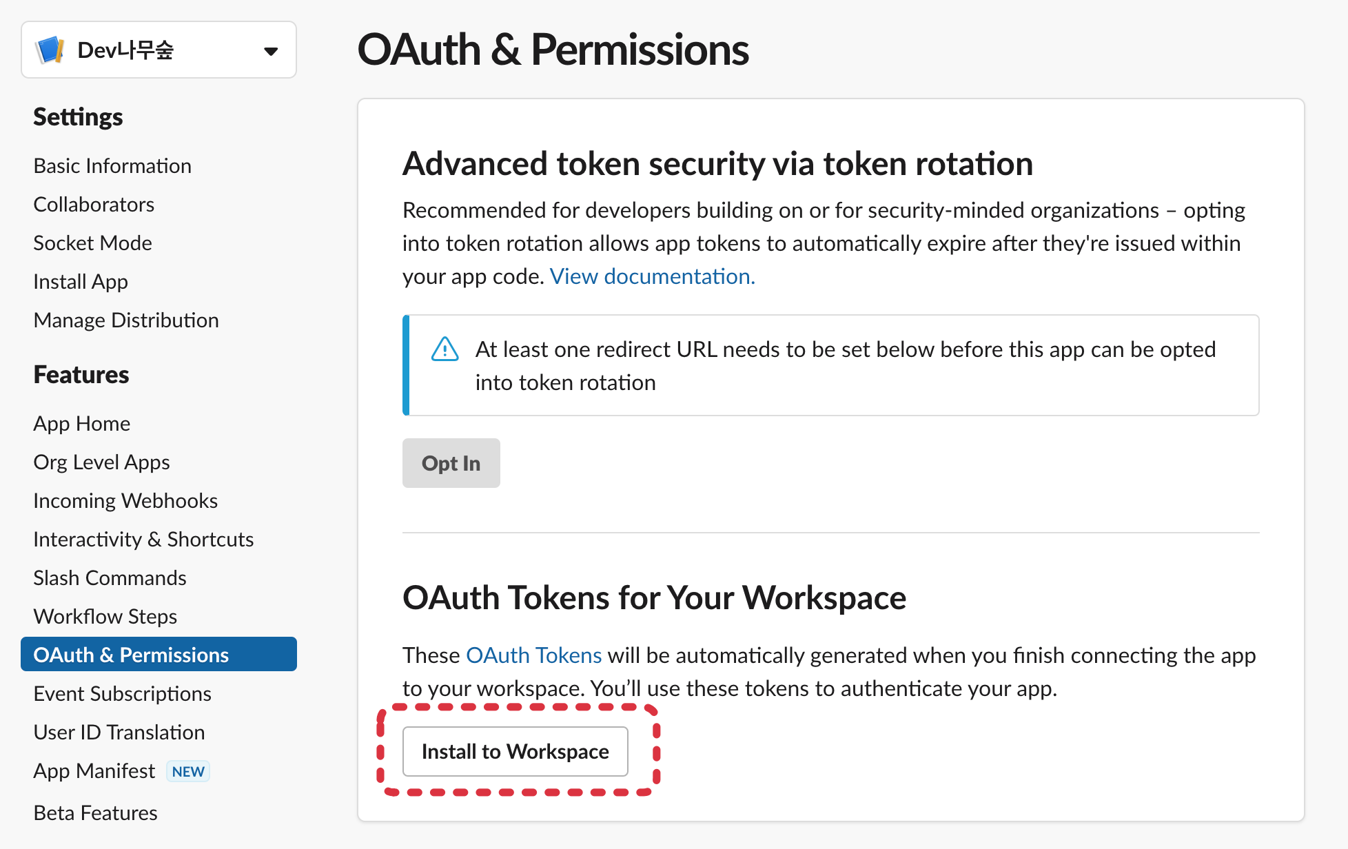 # OAuth & Permission > OAuth Tokens for Your Workspace 에서 확인 가능