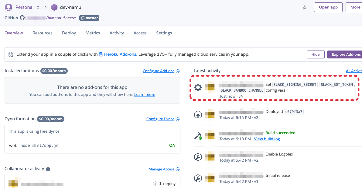 Setting SLACK_SIGNING_SECRET, SLACK_BOT_TOKEN, SLACK_BAMBOO_CHANNEL and restarting (헤로쿠앱 이름)... done, v4