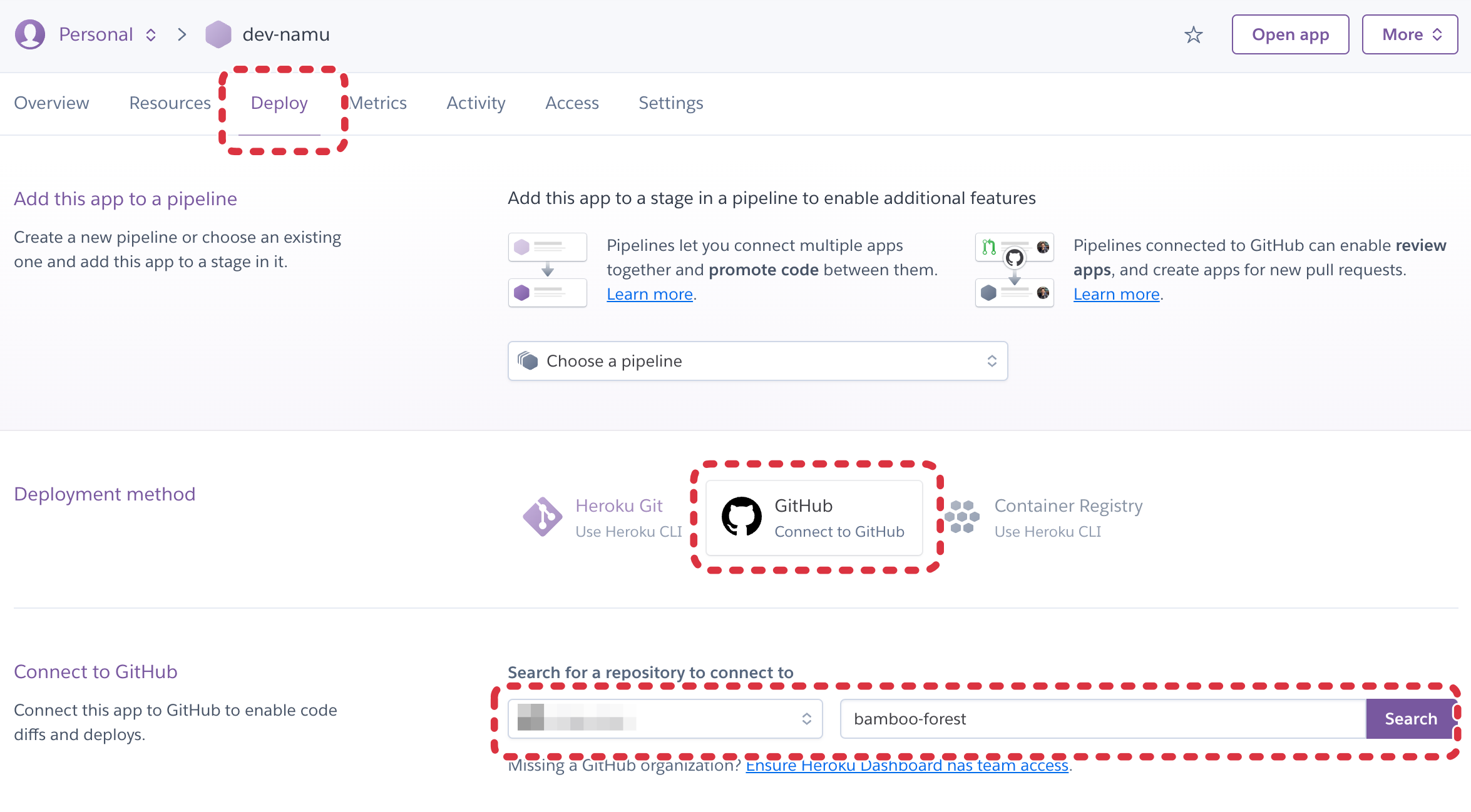이제 Github 코드를 헤로쿠에 연동시켜보자. 상단에 Deploy 탭을 클릭한다. Deploy 화면 가운데 Github을 선택하고 본인 Github 계정을 연동한 다음 Repository 이름을 넣고 Search 버튼을 눌러서 포크한 Repository까지 연결해둔다.