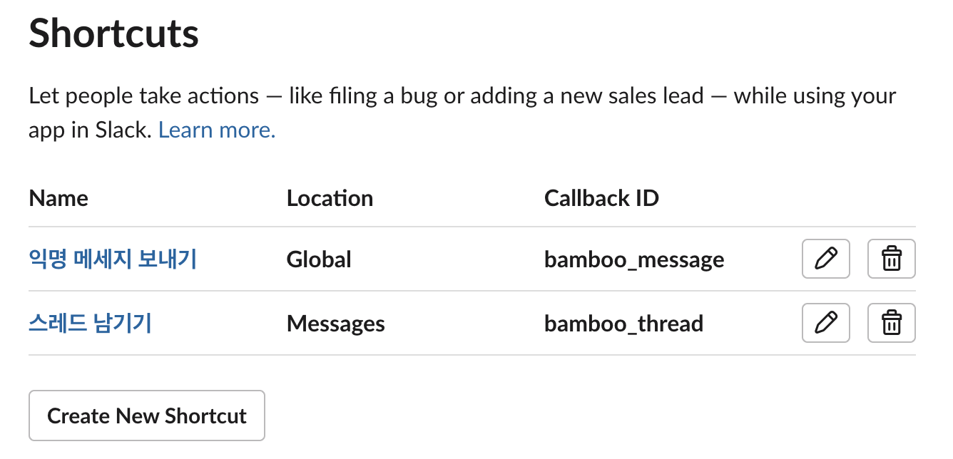 이제 Shortcuts을 만들어주자. Request URL 입력란 아래에 바로 세팅하는 부분이 있다. 먼저 만들 것은 익명 메세지 보내기용 바로가기. Global로 선택하고 바로가기의 이름과 설명, Callback ID를 입력한다. 여기서 주의할 점은 반드시 Callback ID를 'bamboo_message'로 해야하는 점. Bolt.js 서버에서 이 ID로 이미 세팅되어 있어서 만약 다른 ID로 하고 싶다면 서버 코드도 변경해야 한다.