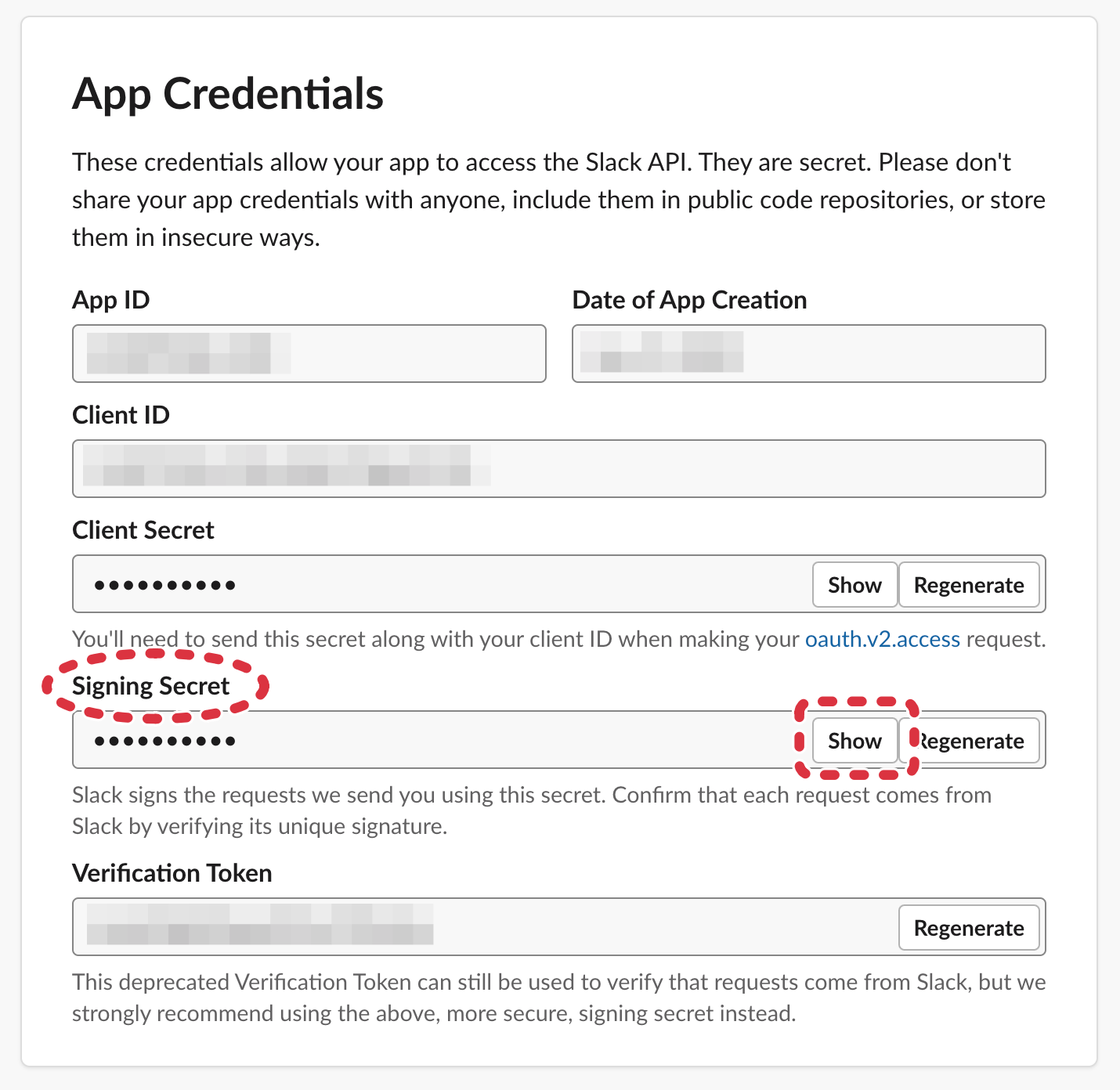 앱 토큰은 Basic Information - App Credentials - Signing Secret에 있다. 'Show' 버튼을 눌러서 내용을 복사한 다음 .env에 붙여넣는다.