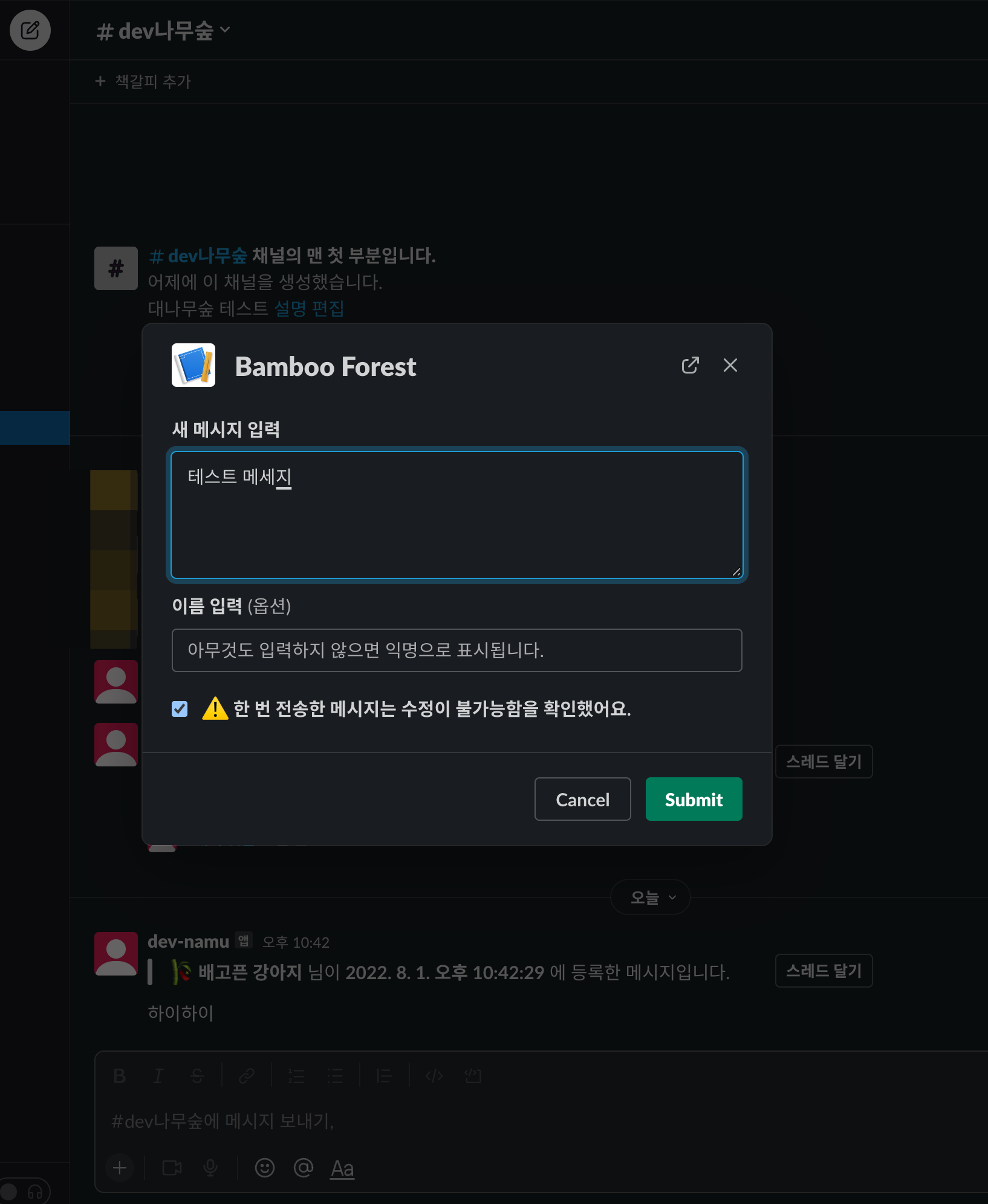 슬랙 채널에 진입해서 익명 메세지 모달(팝업)이 정상적으로 나타나고 입력을 했는데 'Submit' 버튼을 눌러도 채널에 아무런 메세지가 나타나지 않는 경우가 있다. 채널에 봇이 없는 경우인데 채널에 봇을 추가해주면 된다. 그런데 일반 유저 초대하듯 봇을 초대할 수 없다. 그럴 때는 메세지창에 봇을 태그해서 초대할 수 있다.