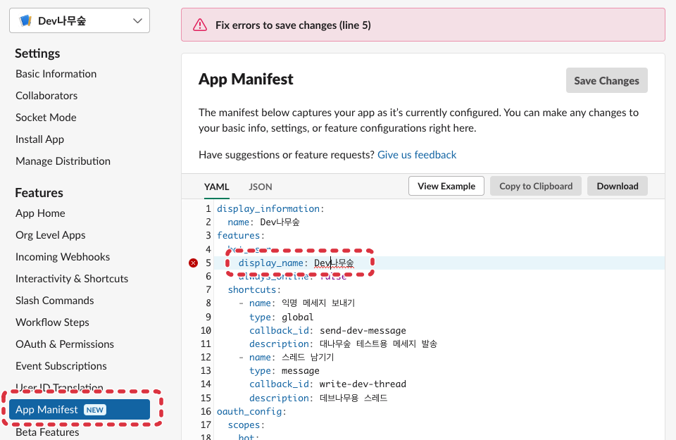 이제는 봇을 만들 차례. 앱은 대나무숲 기능 전반의 시스템을 칭한다. 이 시스템 내에서 대나무숲 메세지를 전달하는 역할을 하는 것이 봇이다. 슬랙에서 유저가 성명과 표시 이름을 세팅할 수 있는 것처럼 봇도 성명(Default username)과 표시 이름(Display Name)을 세팅할 수 있다. 주의사항이 있다. 아래 이미지는 잘못된 사례로 표시 이름은 반드시 영문으로 해야한다. 영문이 아닌 경우는 에러가 나타나는데 그 경우는 하단 "추가로 확인할 사항" 파트에서 확인할 수 있다. 이렇게 해서 기본적인 앱 등록 과정은 끝났다. 이제 봇이 동작하는 코드를 가지고 오자.