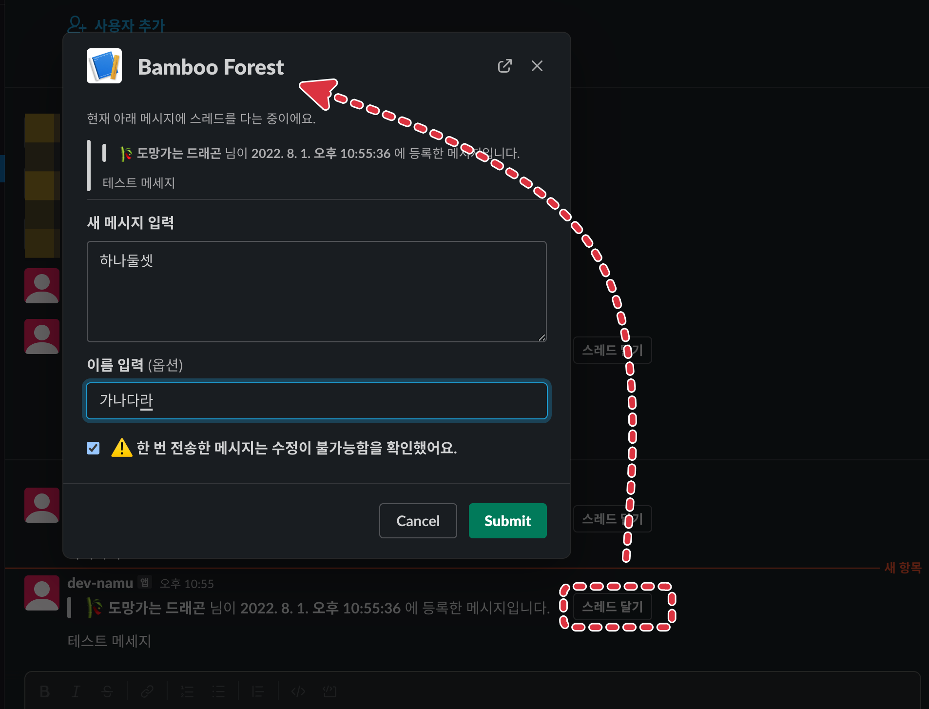 - '/'를 눌렀을 때 대나무숲 슬랙앱이 나타난다
