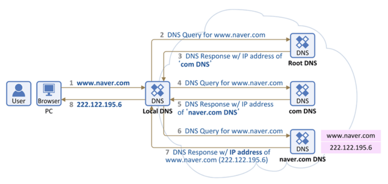 - 로컬 DNS 서버에 해당 URL이 등록되어 있는지 확인 후 있으면 바로 IP 주소를 알려준다.
