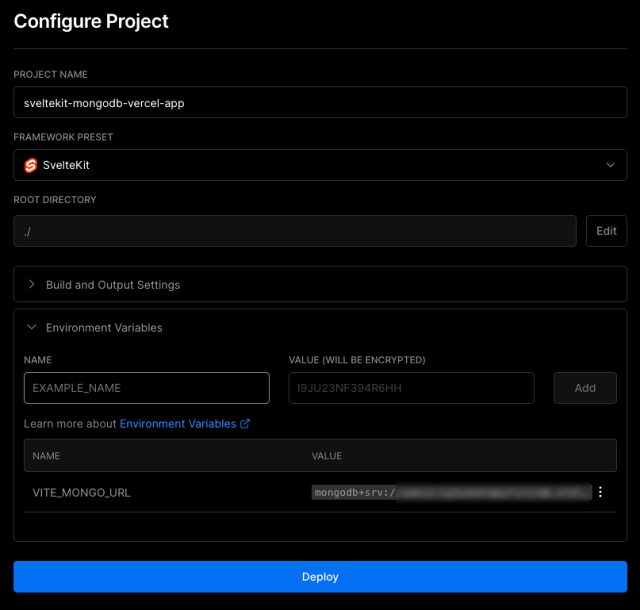 원한다면 Project 이름 정도 변경하고 프레임워크 프리셋은 자동으로 SvelteKit으로 되어 있을 것이다. 만약 그렇지 않다면 SvelteKit으로 바꿔준다. 그리고 무엇보다 중요한 환경변수 입력!!! 접혀있는 Environment Variables를 클릭하고 Name에 VITE_MONGO_URL을, Value에는 env 파일에 있던 URL값을 넣는다. 입력 후 반드시 ADD 버튼을 눌러서 아래처럼 보여야 한다.
