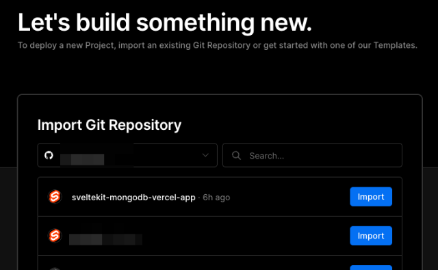 정적 페이지 배포 서비스인 Vercel. 스벨트 개발자가 Vercel로 가면서 Vercel은 스벨트 친화적인 회사가 되었다. 그러니 여기에 배포를 해보자. 물론 Vercel 회원가입 과정은 생략한다.