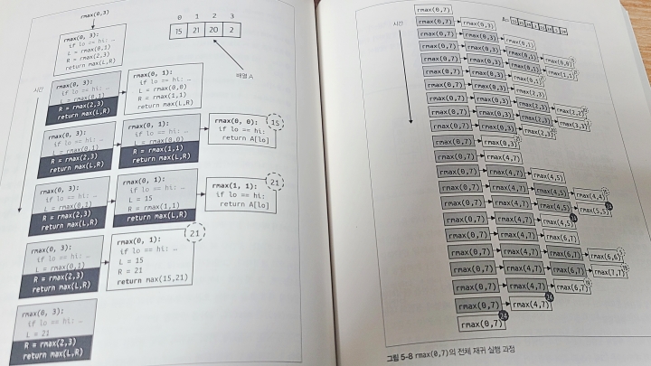 또 다른 예로는 정렬이 적절해 보인다. 정렬 역시도 코딩 테스트의 단골 키워드이다. 삽입 정렬, 선택 정렬, 병합 정렬 등 코테를 위해 학습을 해봤겠지만 실전에서는 어떤 의미를 가지는지 이해하지 못한 분들도 계셨을 것이다. (그게 나야.) 이 책의 5장에서는 정렬의 성능 위주로 설명을 하고 있다. 특히 인상적인 부분이 선택 정렬과 삽입 정렬 성능 설명이 끝난 뒤 5.5절에서 재귀와 분할 정복을 설명하는 부분이다. 재귀 실행 과정을 도식화하여 텍스트를 전체 읽지 않아도 저자의 의도를 쉽게 이해할 수 있었고, 이어질 병합 정렬, 퀵 정렬 등에서 분할 정복을 활용하여 드라마틱하게 성능을 개선한 결과를 볼 수 있다.