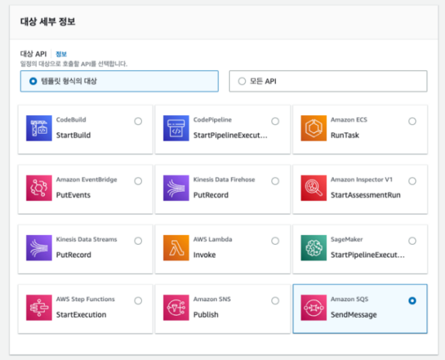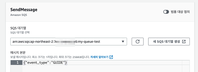 스케줄러 이벤트가 발생되었을 때 발생 대상을 어디로 둘지를 세팅할 차례이다. 대상 API를 Amazon SQS - SendMessage를 선택한다. 아래에 SendMessage 창이 생긴다. 여기에 application.yml에 작성한 SQS 이름을 찾아서 선택하자. 그리고 발송할 메세지를 입력하자. 여기서는 앞에서 소개한 JSON String을 넣으면 된다.