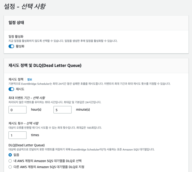 본 스케줄러를 완성하자마자 활성화 시키고 싶다면 일정 상태의 활성화를 ON에 두면 된다. 재시도 정책도 본인이 원하는대로 설정하면 된다. 필자의 경우에는 재시도를 하되 너무 반복적으로 발생되면 오히려 어플리케이션에 부담을 주기 때문에 최소화 형태로 세팅하였다.