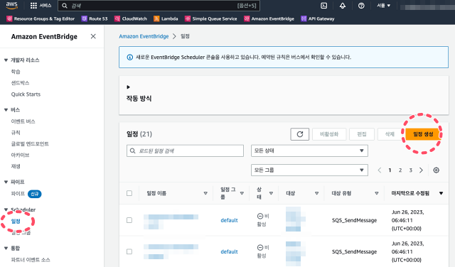 스케줄러에 해당하는 AWS 서비스인 이벤트브릿지를 이용해보자. 아래 이미지를 보면 왼쪽 카테고리에 여러개의 서비스가 보인다. 스케줄러로 이용 가능한 것은 "규칙"과 "일정"이 있는데 비교적 사용이 더 쉬운 "일정"을 선택해보자. 그리고 일정 "생성 버튼"을 클릭한다.