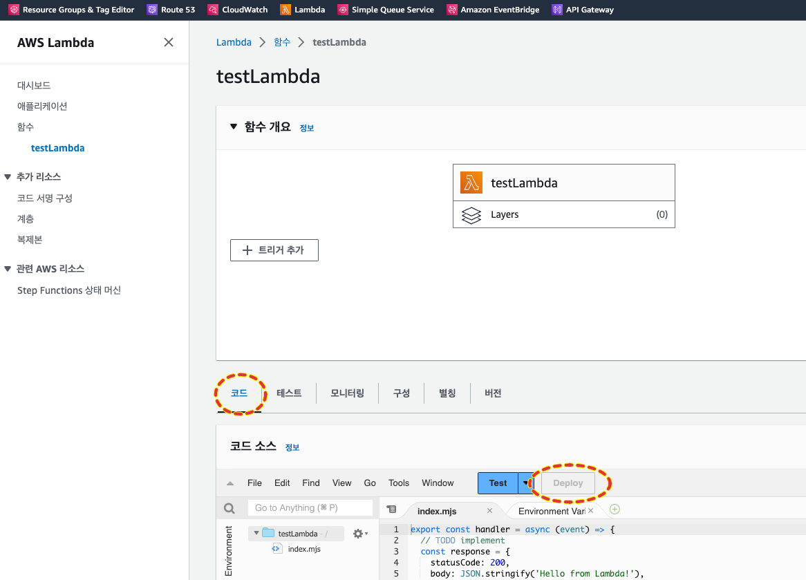 - 코드탭 - 필요한 로직을 입력. 개발 완료 후 Deploy 버튼을 클릭하는 것을 잊지말자.