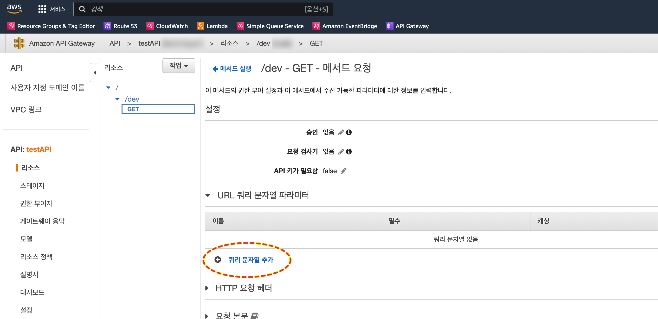 방법은 간단하다. 리소스의 GET을 클릭하고 메서드 요청 버튼을 클릭하면 아래와 같은 화면이 나온다. 여기서 쿼리 문자열 추가를 눌러서 원하는 "파라미터 이름"을 입력한다. 해당 파라미터를 필수로 입력하게 할 건지도 정할 수 있다. 이 파라미터 이름은 Lambda의 event 인자의 queryStringParameters와 일치시킨다. 위 Lambda 예시코드를 참고하자.