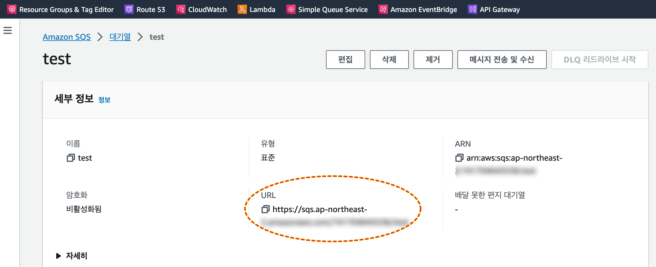 아직 끝난게 아니다. SQS를 생성해야 한다. 이전에 간단하게 SQS 생성한 내용을 작성한 것이 있다. 생성 부분은 여기를 참고하자. 생성을 완료하면 상단의 세부 정보에서 URL을 확인할 수 있다. 이를 복사해서 위 Lambda 코드 내부의 QueueUrl에 입력하면 된다.