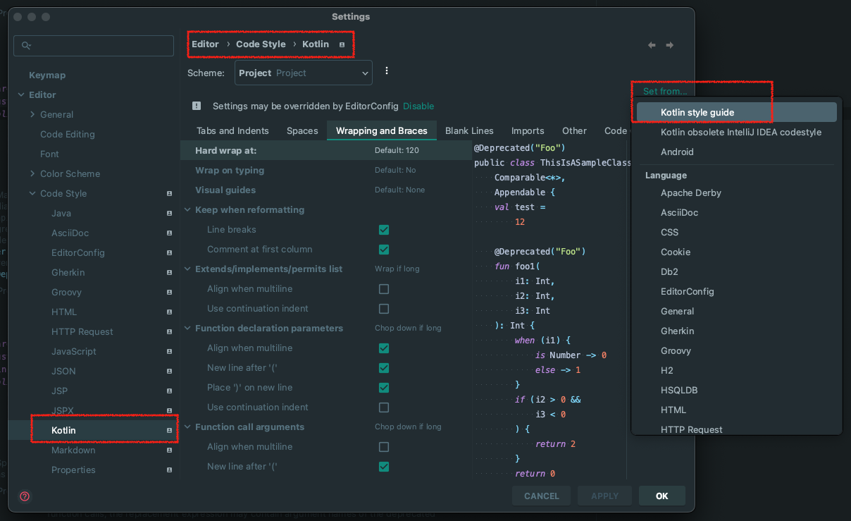 협업으로 개발을 할 때, 각자의 개발 스타일이 다르다보니 서로의 코드를 Merge할 경우에 혼선이 있을 수 있다. 이런 혼선을 막기 위해서 사전에 코딩 컨벤션을 정한다. 코딩 컨벤션을 강제하기 위해서 IDE의 기능을 사용하거나 Lint를 사용하기도 한다. 코딩 컨벤션은 코드 스타일을 정하는 것이기에 코딩 컨벤션을 이야기할 때 스타일이라는 단어가 키워드가 되기도 한다. IntelliJ에서 코딩 컨벤션을 설정할 때 아래와 같은 모습을 볼 수 있다. 이것은 코틀린 코딩 컨벤션을 정하는 방법이다.
