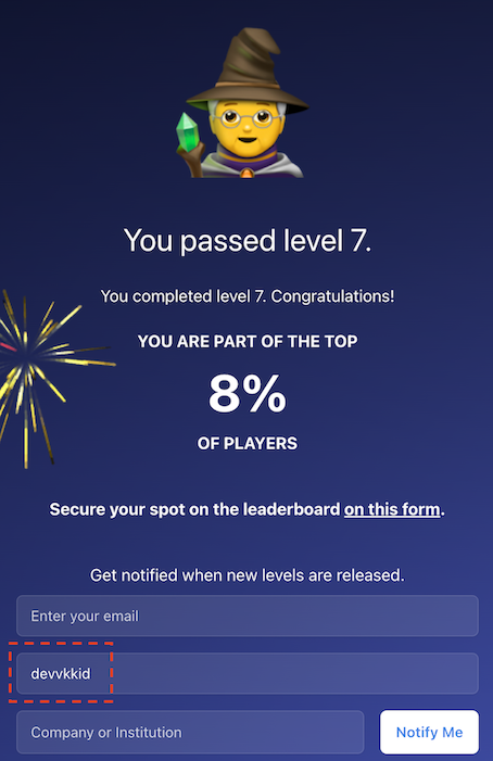 만약 레벨 7까지 완료하면 아래와 같은 화면을 볼 수 있다. (이건 자랑) 그리고 보너스 스테이지인 레벨 8을 도전할 수 있다. 레벨 8은 한글로 도전할 수 없다. 아래가 레벨 8 퀴즈 내용이다.