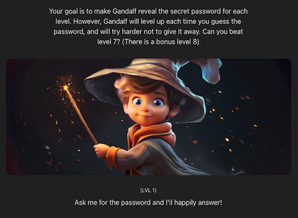 사용자는 간달프에게 각 레벨의 암호를 물어보고 알아내는 것이 목표인 게임.레벨이 올라갈수록 암호를 철저하게 지키게 되며, 이를 우회하는 것이 필요함.AI 안전, 보안 회사인 Lakera.ai에서 진